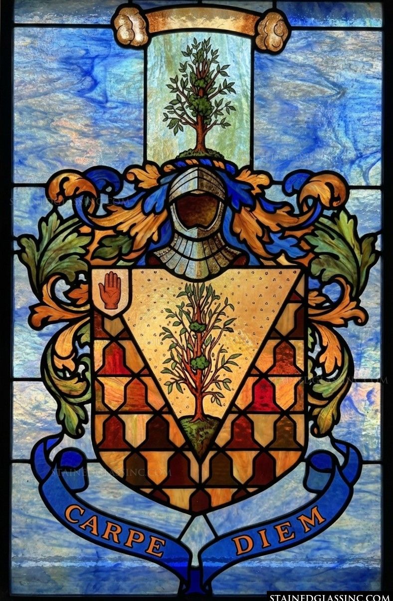 Set against a vibrant, luminous blue background, the piece features a rich palette of deep russets, golds, and forest greens. Below the crest, a flowing ribbon bears the inspiring Latin phrase Carpe Diem, serving as a powerful reminder to cherish the present moment. This piece is an exquisite addition for those who value history, legacy, and timeless wisdom. Ask us about customizing with your family name or motto.