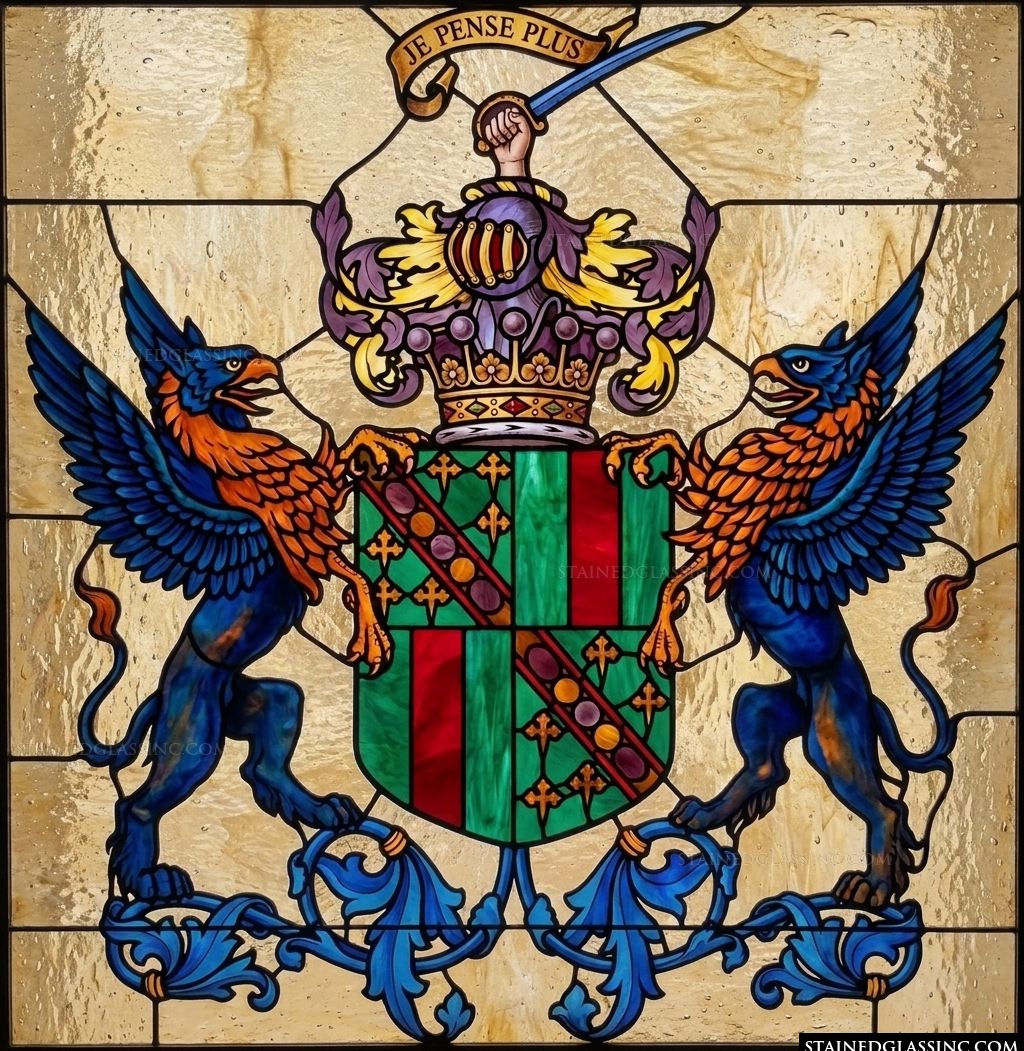 The meticulous composition balances classic ornamental motifs with a dramatic, vibrant color palette. This sophisticated display serves as a timeless focal point for any space, capturing the artistry of traditional emblems with brilliant clarity and a sense of enduring authority. Ask us to customize this window or door panel with your family name or motto.