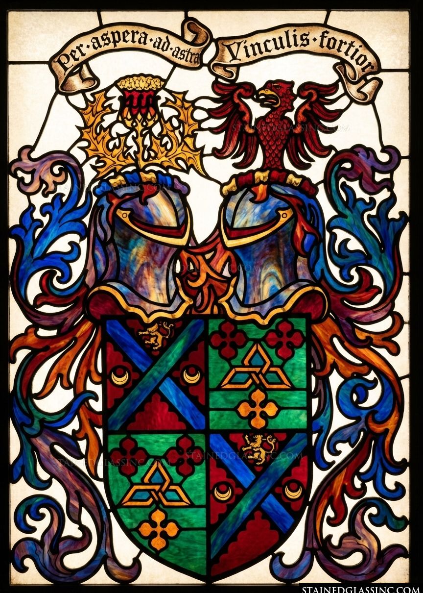 Celebrate the noble tradition of heraldry with this striking and luminous design. Featuring a meticulously quartered coat of arms, the artwork is anchored by a powerful display of color, combining rich crimsons, deep emerald greens, and royal blues that seem to glow from within. The central shield is flanked by ornate, sweeping mantling that adds a sense of movement and grand architectural presence to the composition.