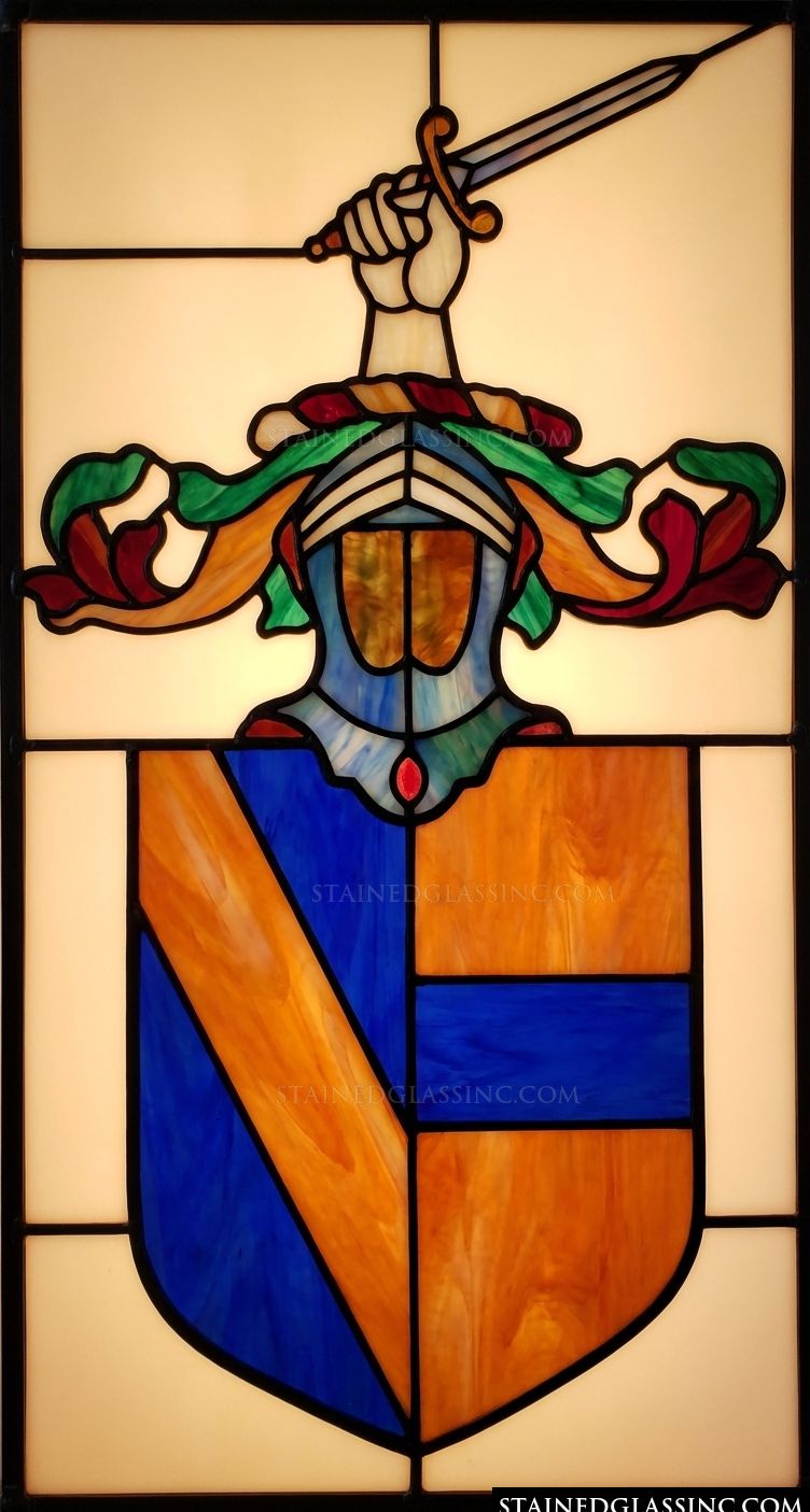 The composition is crowned by an uplifted sword, hand-held in a gesture of resolve and protection. The luminous colors and clean lines bring this traditional emblem to life, making it a perfect statement piece for those who appreciate the beauty of classic heraldry and the enduring spirit of chivalry. Ask us to customize this window or door panel with your family name or motto.