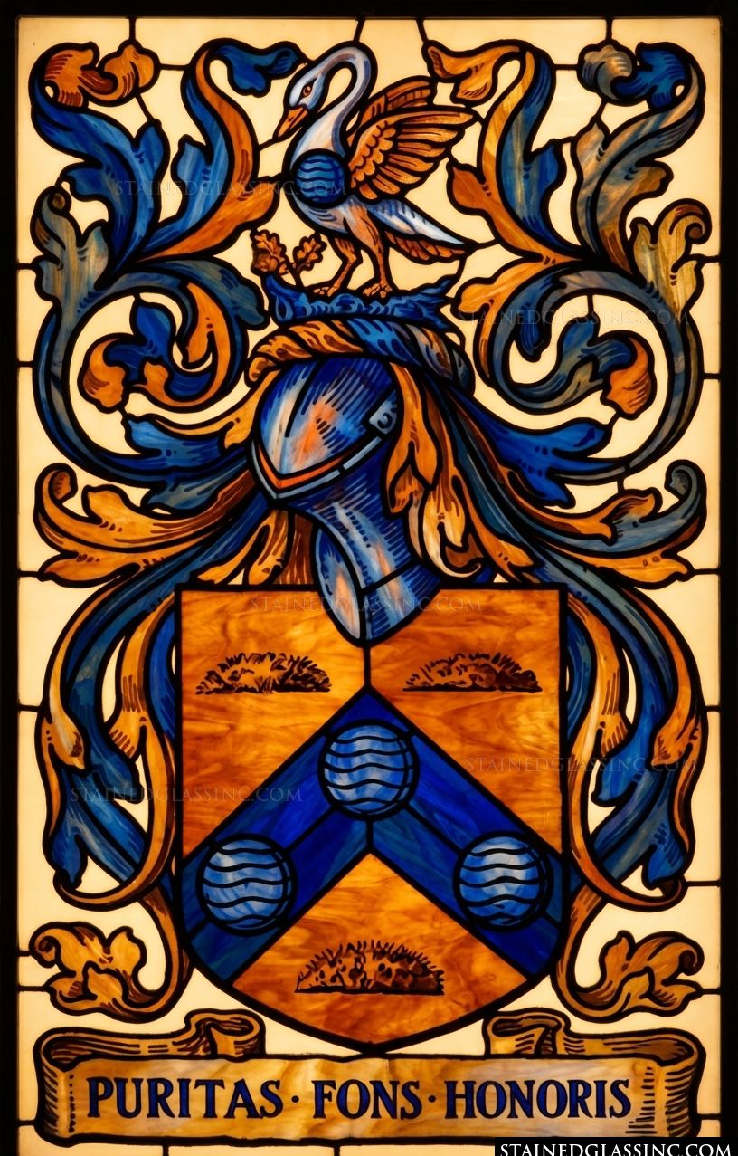 Surmounting the crest, a graceful swan stands as a symbol of elegance and purity. Below, the noble motto Puritas Fons Honoris - meaning "Purity is the Fountain of Honor" - is elegantly inscribed on a flowing banner. This sophisticated piece brings a touch of historical majesty and noble character into your home, beautifully showcasing the artistry of heraldry. Ask us to customize this window or door panel with your family name or motto.