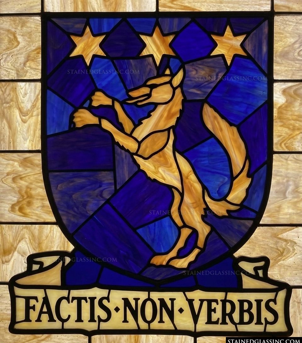 Below the shield, a scroll gracefully displays the stirring Latin motto, Factis Non Verbis - or 'By deeds, not words.' This piece serves as a sophisticated reminder of the importance of action, making it a perfect addition for those who value honor, history, and distinguished craftsmanship. Ask us to customize this or a similar window or door panel with your family name or motto.