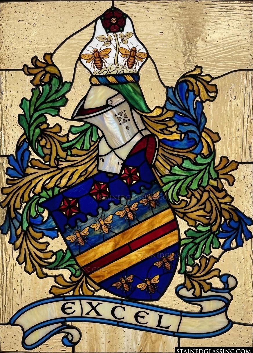 This stately heraldic design brings a sense of tradition and pride to any space. Centered around a shield adorned with golden bees and vibrant blue motifs, the composition is anchored by a matching helmet crest and an elaborate flowing banner. The imagery of industrious bees represents community and diligence, making this a thoughtful addition to a home office, study, or library.