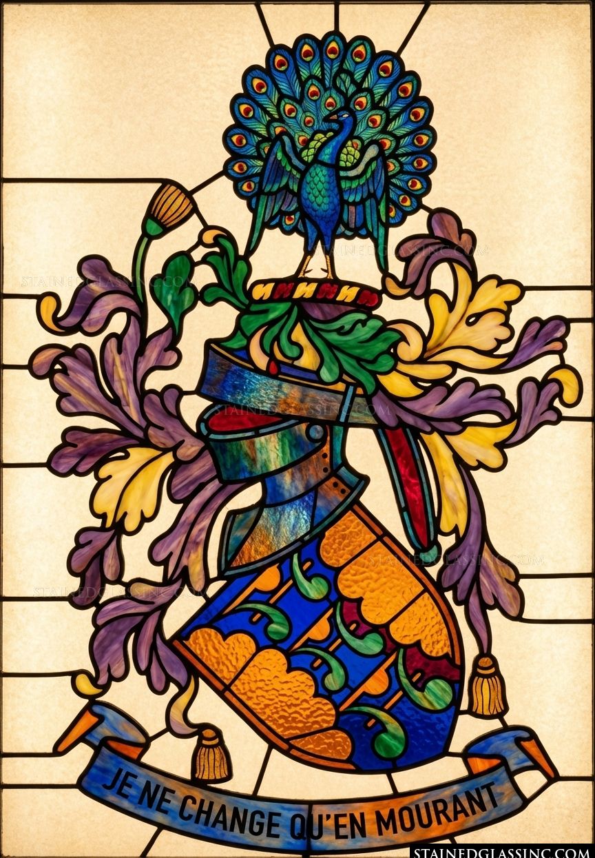 Flowing, elaborate acanthus leaves in soft violet and amber unfurl around the central crest, adding a sense of graceful motion to the composition. Below, a banner proudly displays the classic French motto, "Je ne change qu'en mourant" (I change only in death), grounding this piece in themes of steadfast loyalty and enduring honor. Ask us to customize this or a similar window or door panel with your family name or motto.