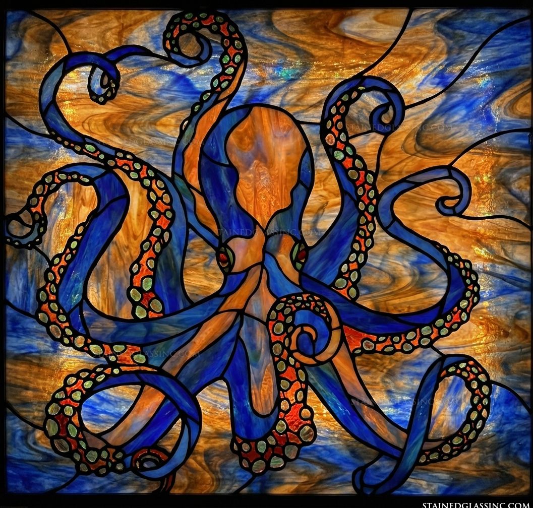 Bring the mysteries of the deep sea to your home with this striking octopus design. The creature is rendered with graceful, fluid lines, its tentacles curling and reaching across a background of swirling, luminous amber and rich, deep blue tones.