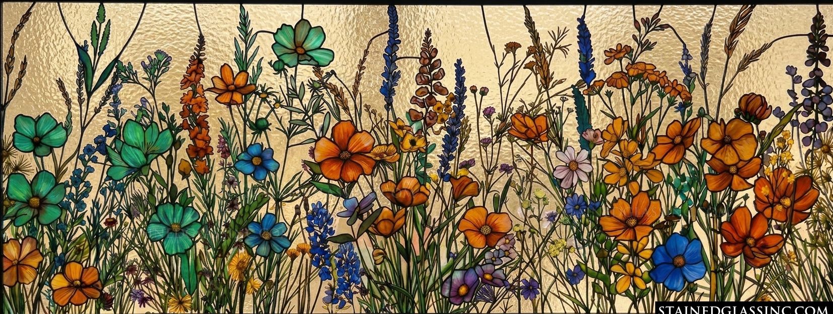 Bring the timeless charm of a sun-drenched meadow into your home with this exquisite, stained-glass-style design. An untamed array of wildflowers stretches across the canvas, showcasing a breathtaking spectrum of color, from deep, cool blues and verdant teals to fiery oranges and soft, golden hues. Each bloom is rendered with intricate detail, mimicking the organic flow of a natural landscape in full summer glory.