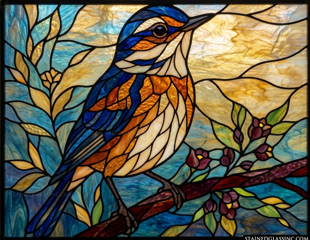 Experience the serene charm of a quiet moment in nature with this exquisite, stained-glass-style design. A delicate bluebird, captured in rich, saturated hues of cobalt, amber, and creamy white, sits serenely upon a blossoming branch. The intricate lines and glowing textures bring the scene to life, creating a sense of calm and natural wonder that fills any space with soft, radiant light.