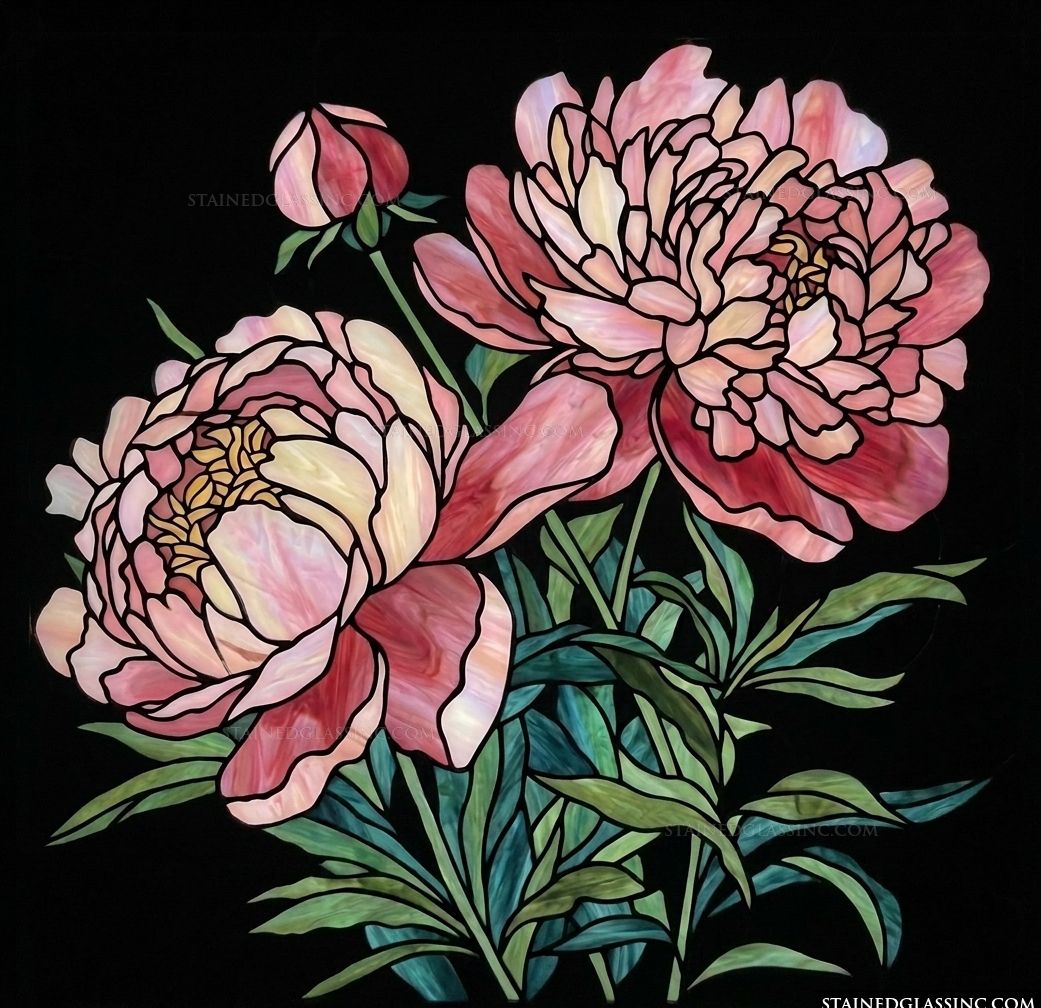 Immerse your space in the romantic charm of this stunning floral composition. Two magnificent, fully bloomed peonies take center stage, their petals captured in delicate shades of blush and deep rose, glowing with a soft, lifelike radiance. A gentle bud reaches upward, adding a sense of graceful movement and natural development to the arrangement.