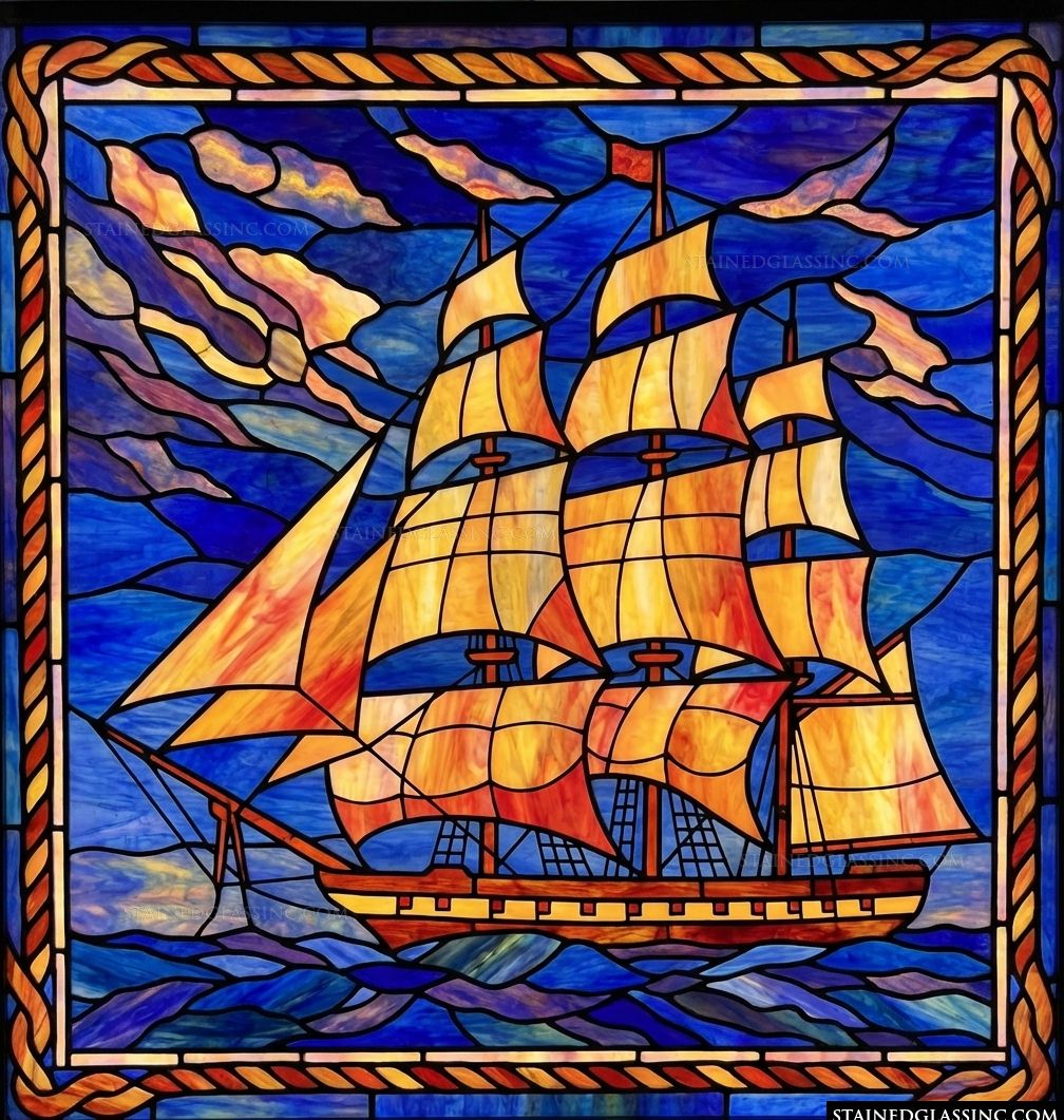 This stunning decorative piece showcases a magnificent tall ship navigating turbulent blue waters. The sails are rendered in warm, vibrant shades of amber and gold, creating a beautiful contrast against the deep, swirling blue of the stormy sky and sea.