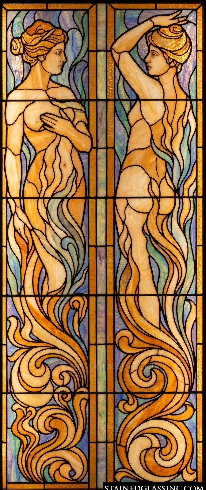 This exquisite decorative insert showcases the fluidity and elegance characteristic of the Art Nouveau movement. The imagery features two classically styled female figures, presented with graceful poses and organic, swirling lines that suggest movement through water or air.