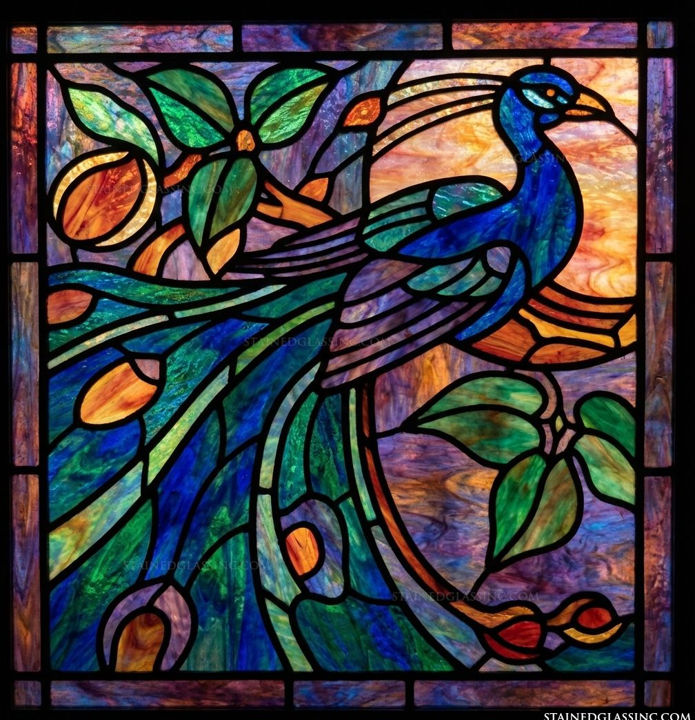 The artwork utilizes varied glass textures to capture light, enhancing the depth and saturation of the colors. This decorative insert brings a sophisticated, timeless elegance to any interior, perfectly suited for adding a vibrant focal point to your home.