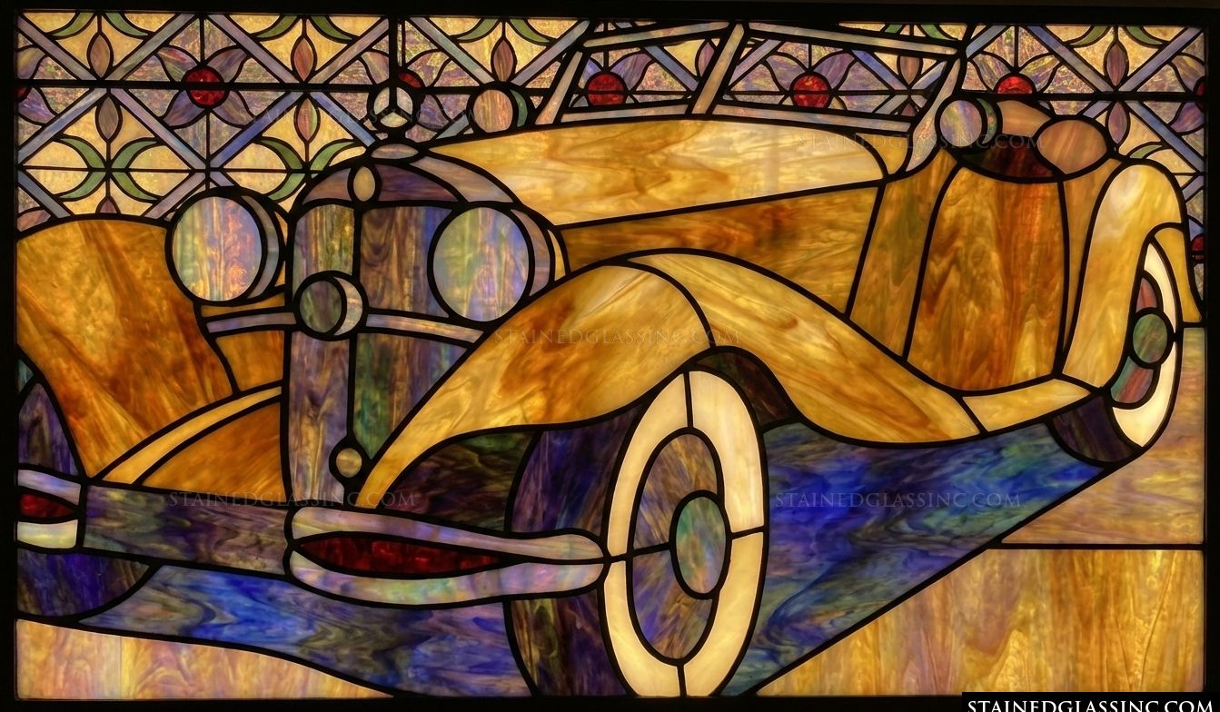 This captivating decorative insert features a stylish, vintage-inspired roadster set against an intricate geometric background. The design draws heavy inspiration from the art deco movement, utilizing fluid, sweeping lines that capture the classic grace of a bygone era of automotive luxury. The use of warm, textured amber and gold hues creates a sense of richness, contrasted beautifully by the bold blue tones at the base.
