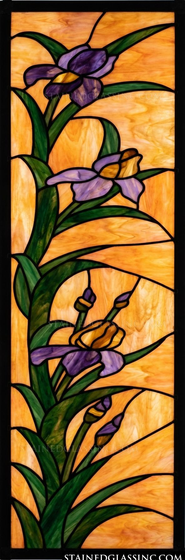 This vertical insert features a striking depiction of irises in full bloom. The design showcases vibrant purple petals with delicate golden accents, perfectly complemented by lush, deep green leaves that reach upwards, creating a sense of natural movement.