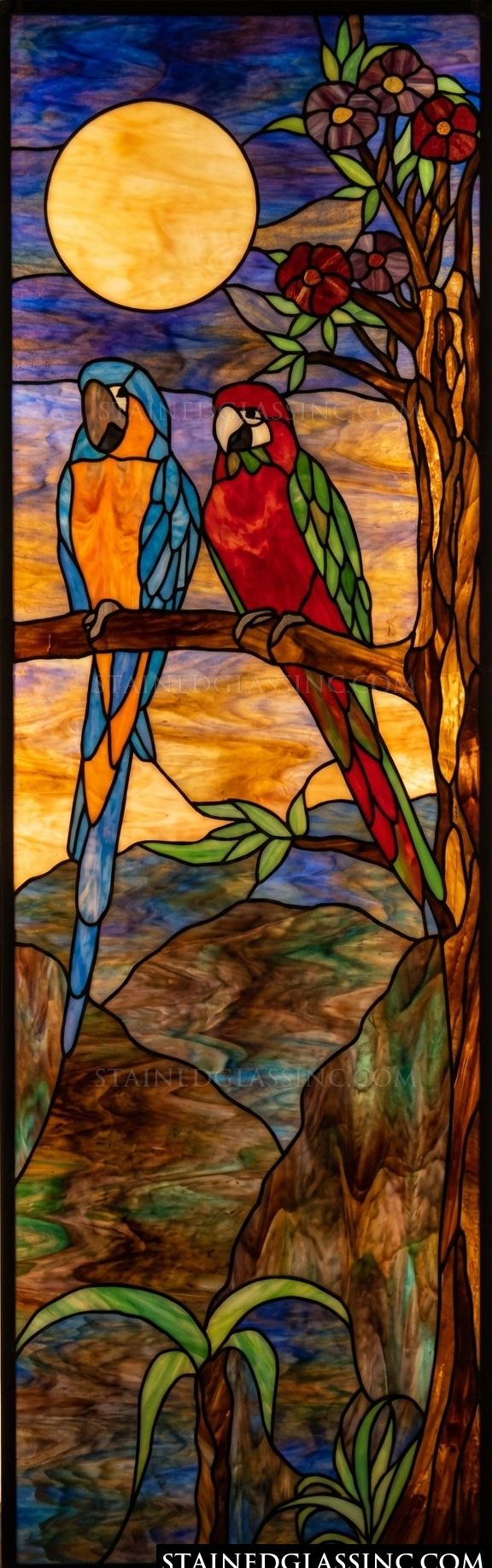 This stunning decorative piece showcases a pair of colorful macaws perched together on a rustic tree branch. The warm, amber-toned full moon sets a serene backdrop against a dramatic, textured sky filled with swirling shades of blue, gold, and orange, reminiscent of a breathtaking sunset.