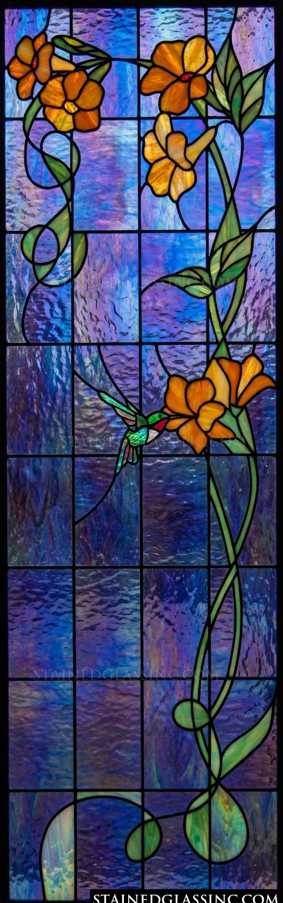 This beautiful art piece captures a graceful scene of a small hummingbird hovering to feed on bright, warm-toned orange blossoms. The floral stems swirl elegantly across the composition, creating a sense of movement and natural beauty.