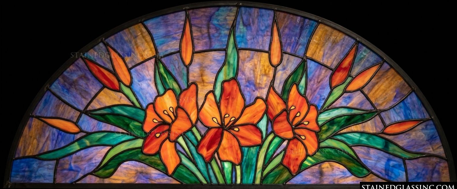 This beautiful stained glass piece is designed in a fan or transom shape, perfect for placing above doorways or windows. The central motif consists of three blooming orange lilies, accompanied by several closed buds, all rendered in vibrant, warm tones that stand out against the backdrop.