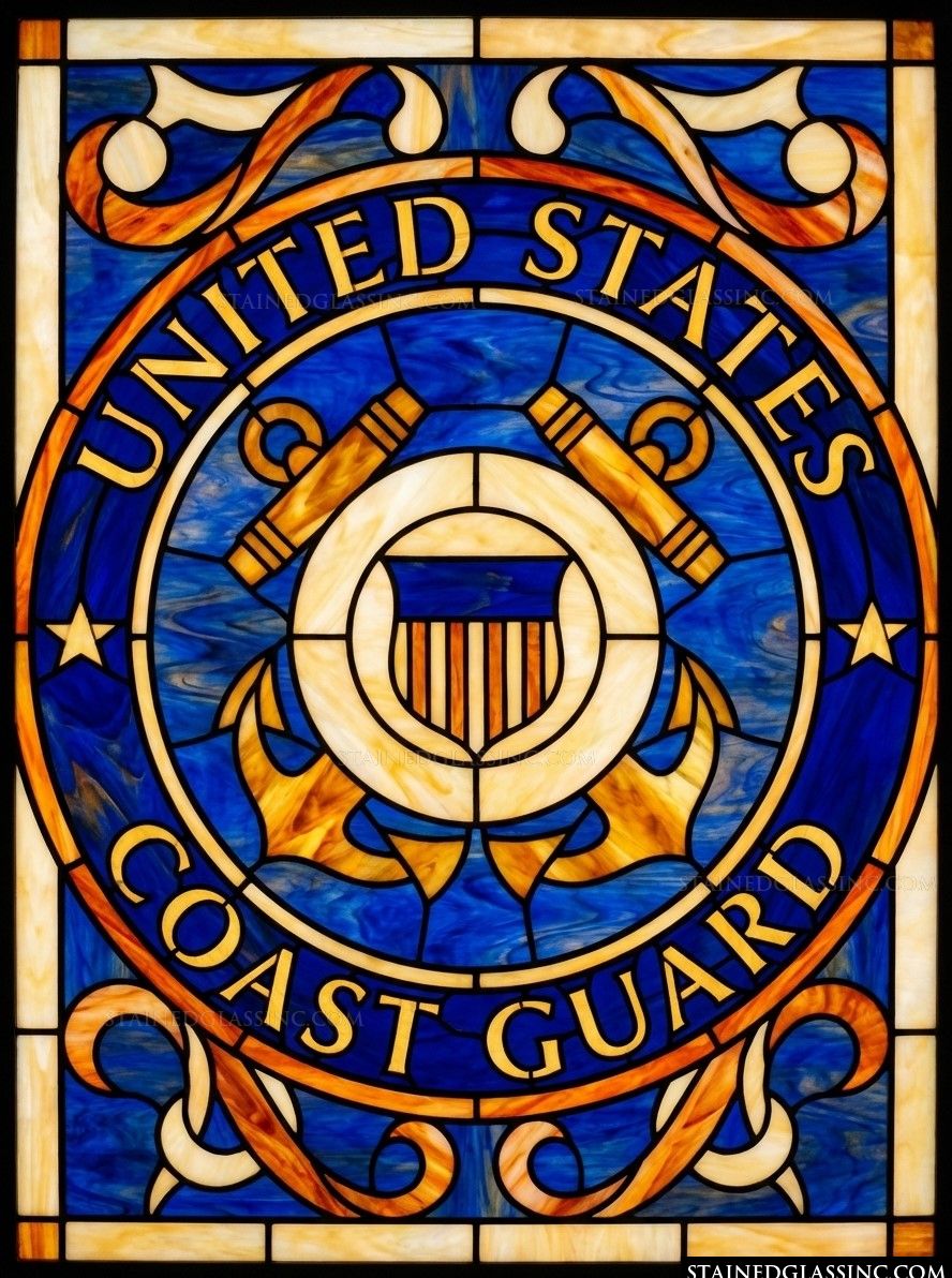 Honor the courage and dedication of those who serve with this masterful stained-glass-style design featuring the official emblem of the United States Coast Guard. The composition is anchored by the iconic seal, rendered in a bold, authoritative palette of deep maritime blues and warm, glowing amber tones. Each line and curve of the anchor, life preserver, and shield is captured with precision, creating a truly regal appearance.