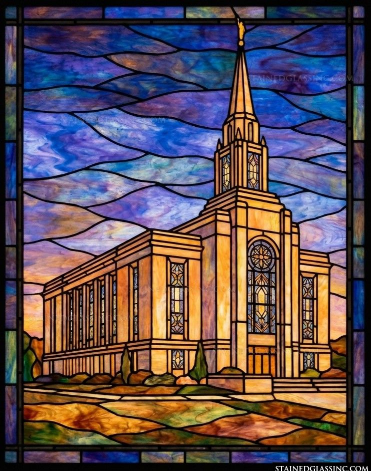 This exquisite stained-glass-style design captures the serene majesty of a grand Later Day Saints Temple at dusk. The building is rendered in warm, luminous shades of gold and amber, suggesting the soft, inviting glow of lights from within. Its precise architectural lines draw the eye toward the towering spire, reaching upward in a testament to faith and craftsmanship.