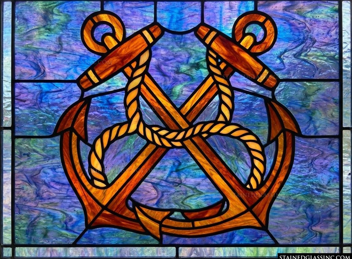 This evocative stained-glass-style design captures the spirit of maritime tradition and steadfast hope. Two sturdy anchors are crossed in perfect symmetry, intricately entwined with golden, braided nautical rope that highlights the masterful composition of the piece.