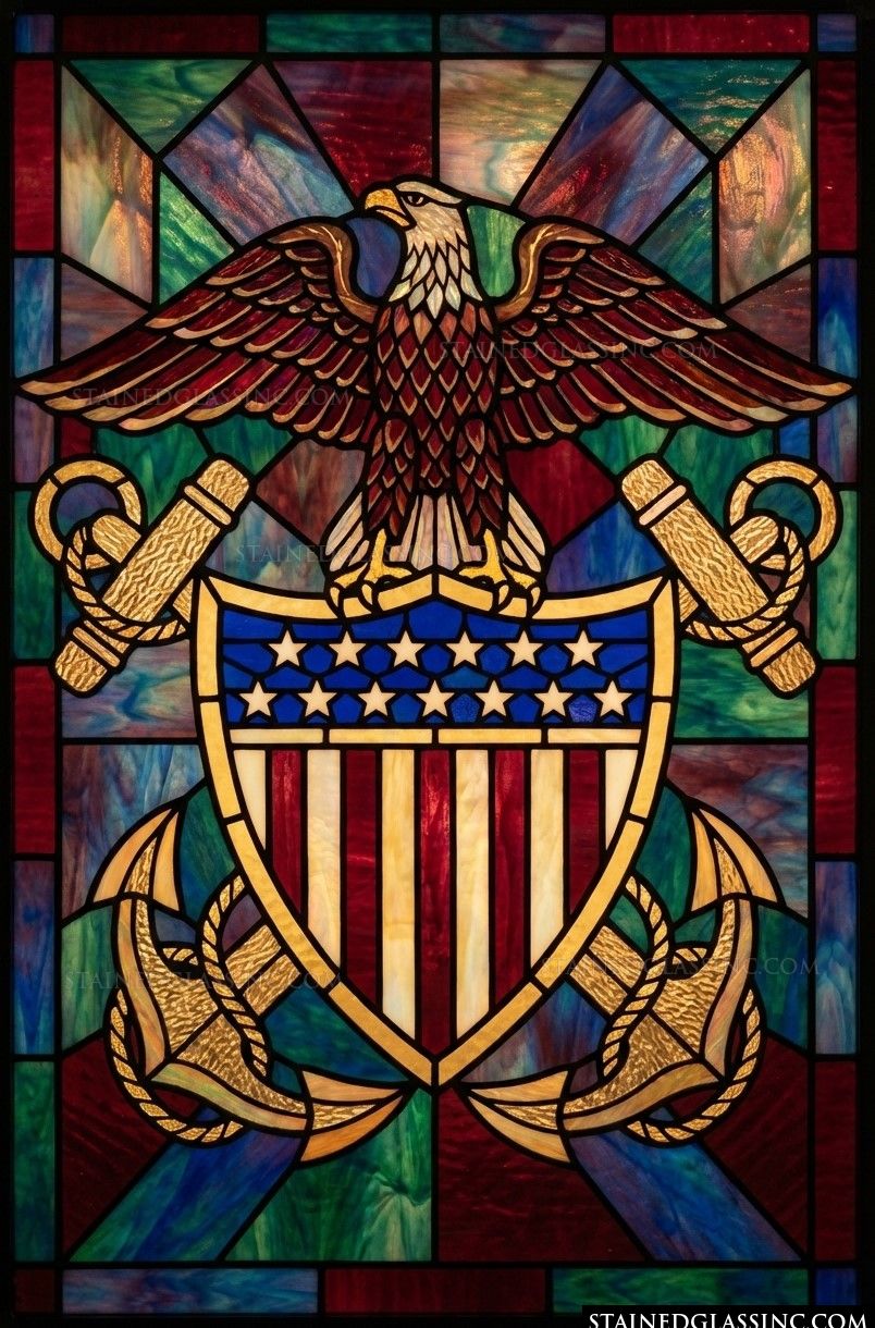 Celebrate the spirit of patriotism with this commanding design. At its heart lies the proud American bald eagle, wings outstretched in a display of strength and vigilance. Below the eagle, the iconic shield of the United States is flanked by the crossed anchors and gold ropes that distinguish the U.S. Navy, creating a powerful emblem of honor and duty.