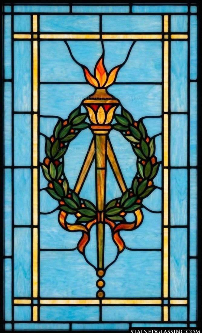 Celebrate the timeless symbolism of enlightenment and victory with this luminous, stained-glass-style design. The central motif features a golden torch, its flame captured in vibrant oranges and ambers, signaling a spirit of inspiration and guidance. The torch is elegantly framed by a detailed laurel wreath, rendered in rich, deep greens that provide a striking contrast to the warm golden tones.
