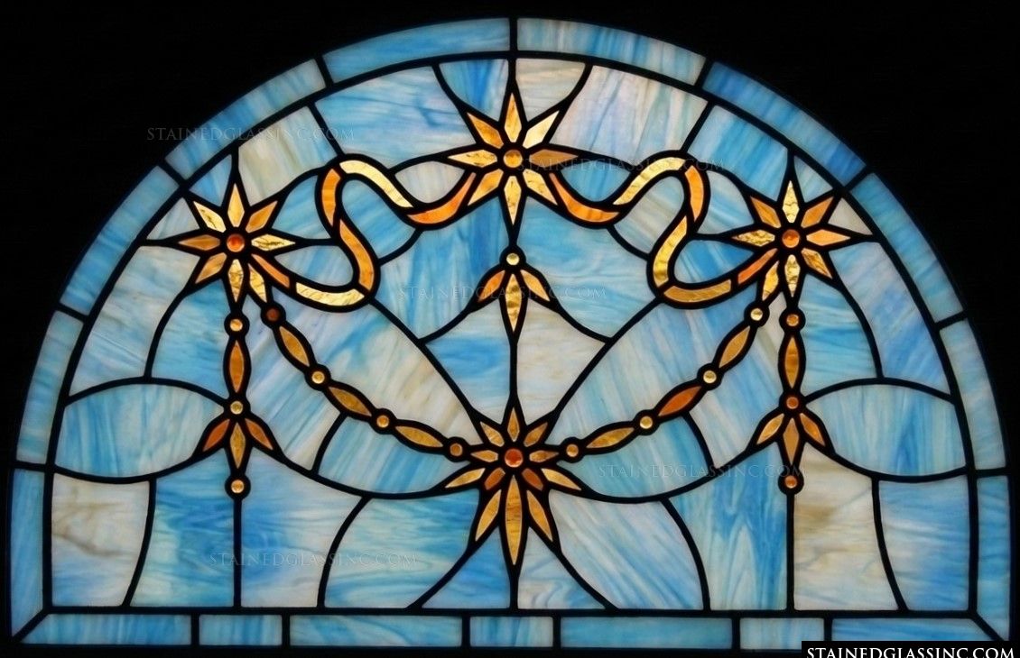 This exquisite, arched design captures a sense of timeless sophistication and celestial beauty. Radiant golden stars serve as the focal point, anchored by flowing, intricate ribbons and swags that impart a feeling of elegance and grace. The artistry balances classic decorative motifs with a rhythmic, harmonious composition.