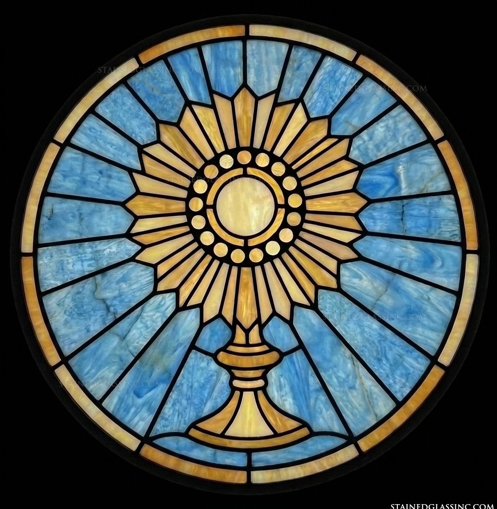 This exquisite circular design centers on a golden monstrance, a powerful symbol of the Blessed Sacrament. The intricate artistry captures the radiant energy of the rays extending outward, evoking a sense of divine light and spiritual focus that draws the eye to the central host.