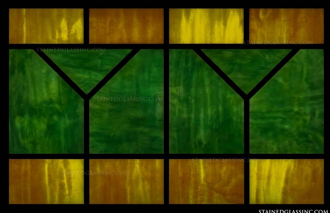 Complementing the green elements are warm, radiant bands of golden amber at the top and bottom. These glowing, earth-toned sections anchor the design and provide a brilliant contrast, enhancing the overall sense of warmth and light. This stained-glass-style artistry is perfect for adding a touch of contemporary elegance and refined color to any space.