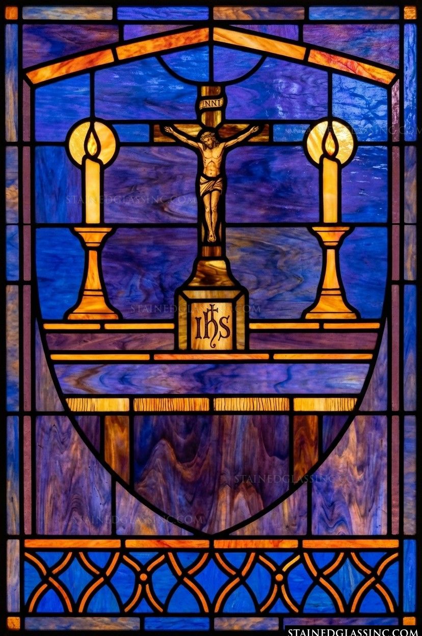 This evocative design captures a moment of profound spiritual stillness. At its heart, the figure of Christ on the cross stands as a testament to sacrifice and redemption. Below, the sacred IHS monogram is elegantly displayed, grounding the scene in tradition and faith. The rich, deep blues of the background create a contemplative atmosphere, while the warmth of the altar candles casts a soft, inviting glow.
