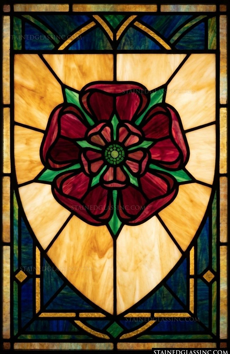 This exquisite stained-glass-style design captures the timeless elegance of the iconic Tudor Rose. A rich, deep crimson flower blooms at the center, its petals perfectly balanced by vibrant green accents that lend a sense of organic vitality to the heraldic composition.