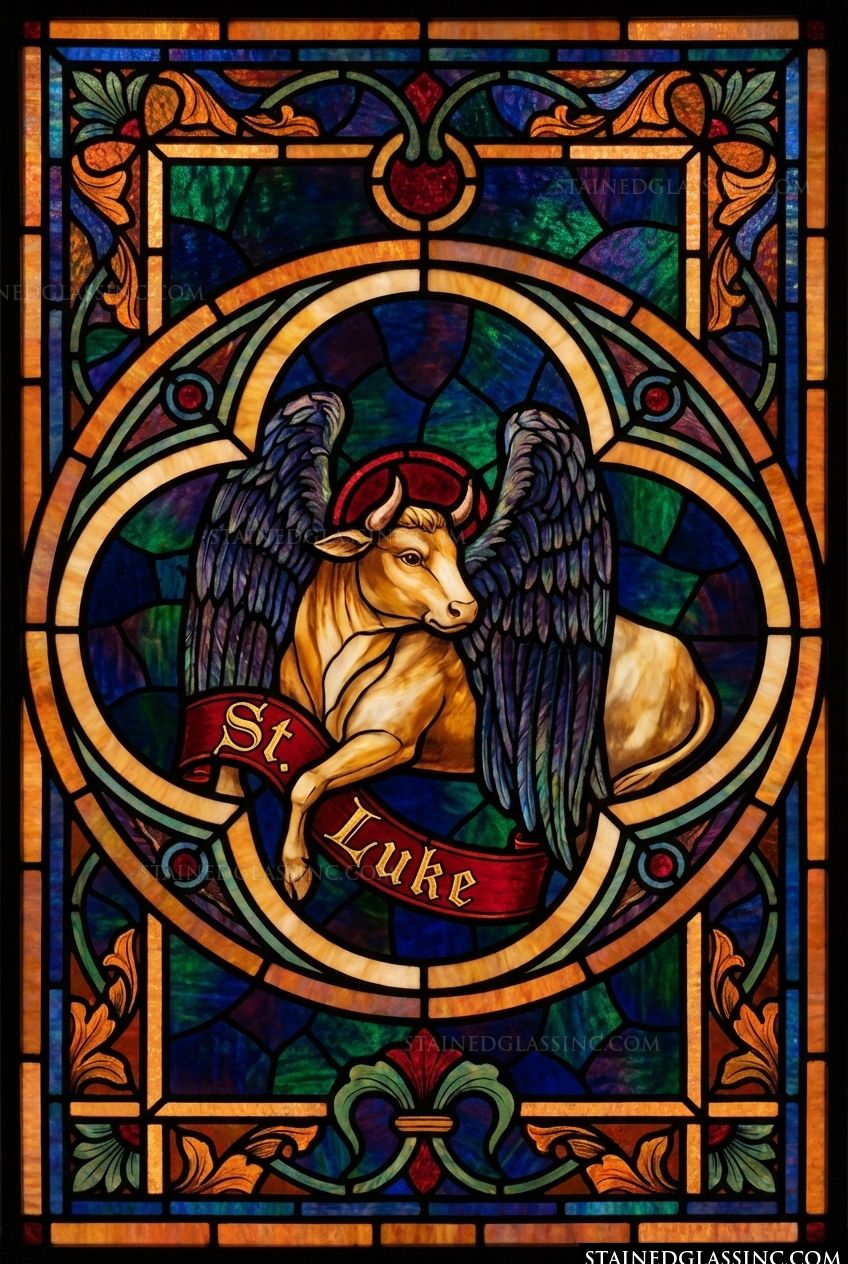 Celebrate the profound symbolism of the Evangelists with this luminous, stained-glass-style artistry depicting Saint Luke. The central motif features the majestic winged ox—the traditional icon representing Luke—captured with a serene, dignified expression and sweeping, detailed wings. Rich, golden hues illuminate the figure, creating a sense of warmth and divine inspiration.