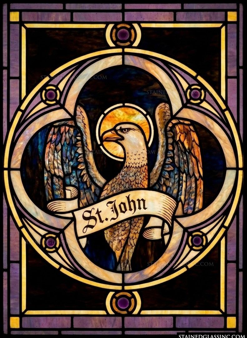 Celebrate the profound symbolism of the Evangelists with this striking artwork. At its center stands a noble eagle, wings partially spread, serving as the timeless emblem of St. John. The figure is grounded by a scroll bearing his name, set against a radiant, halo-inspired backdrop that draws the eye inward.