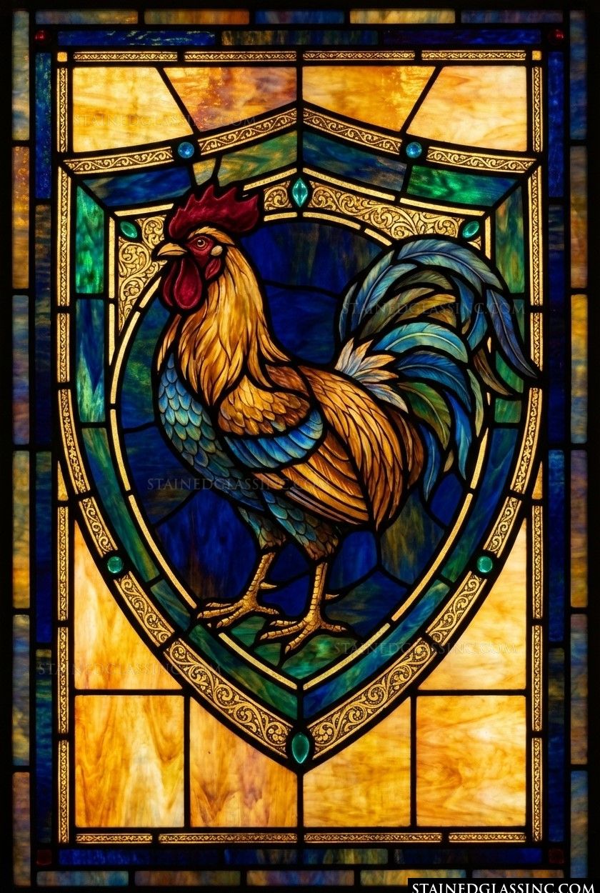 Celebrate the boldness of nature with this striking design, featuring a proud rooster captured in vivid, sun-drenched detail. The bird is framed within a sophisticated shield, its plumage rendered in an elegant gradient of deep cobalt, warm amber, and fiery red, creating a sense of movement and vitality.