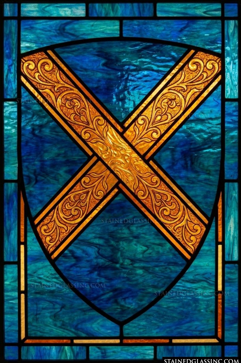 This striking stained-glass-style design centers on a classic saltire cross, a timeless symbol honoring the legacy of St. Andrew. The cross is rendered in a rich, burnished gold, featuring intricate, flowing acanthus-inspired scrolling that catches the light and adds a sense of regal depth to the piece.