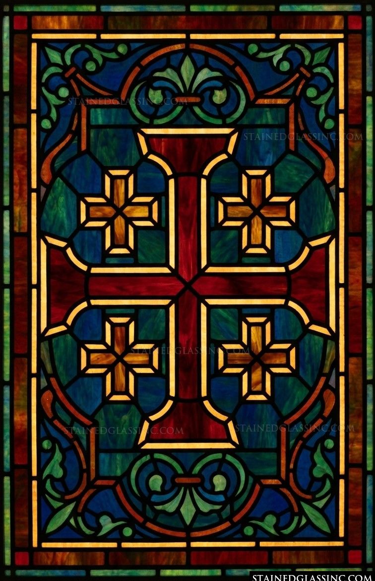 Embrace the timeless beauty of this iconic Jerusalem cross, rendered in a striking, luminous palette. The central cross, bold and regal in deep shades of crimson, is perfectly complemented by the smaller golden crosses nestled in each quadrant. This harmonious composition serves as a profound symbol of faith, beautifully articulated through glowing light and classic ecclesiastical artistry.