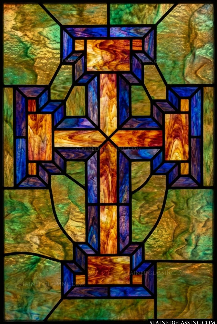 This exquisite design centers on a bold, geometric cross, rendered in a striking palette of warm, swirling amber and deep, rich cobalt. The interplay of these contrasting hues creates a sense of depth and movement, suggesting a radiant inner light that glows from within the composition.