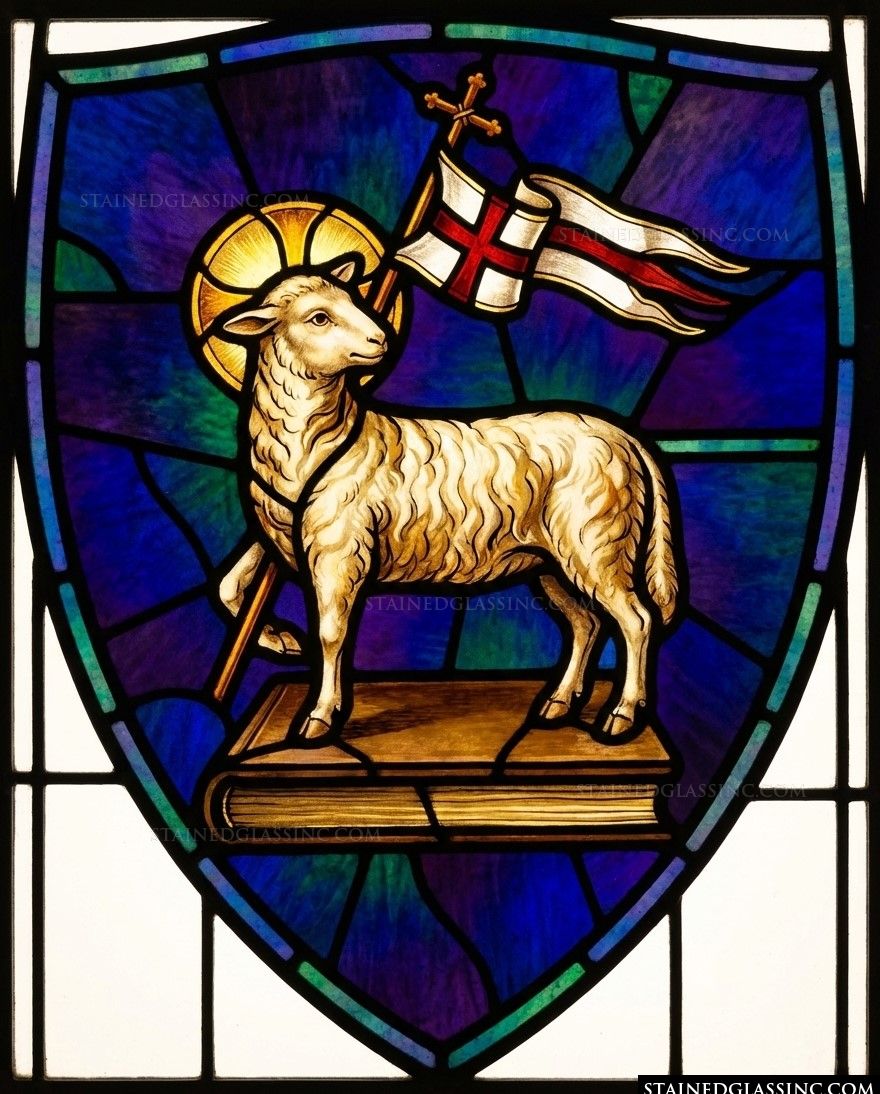 This classic Agnus Dei representation captures the powerful symbolism of the Lamb of God. Standing resolute atop the Book of Life, the lamb is adorned with a glowing halo, signifying divinity and purity. The accompanying banner, marked with a prominent cross, serves as a testament to faith and redemption.