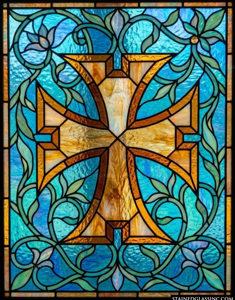 This captivating piece showcases a central, golden Maltese cross, crafted with rich amber tones that seem to glow with internal warmth. The cross serves as a symbol of steadfast faith and courage, standing out brilliantly against a breathtaking backdrop of vibrant azure and teal.