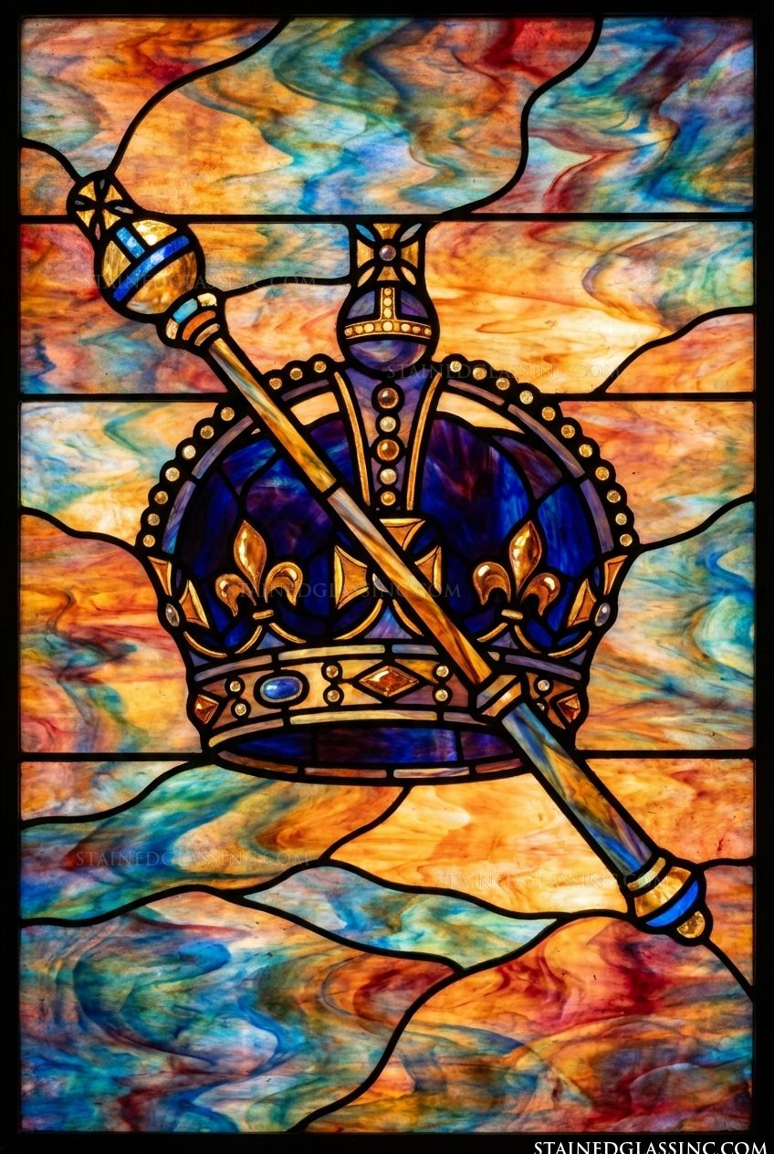 This striking stained-glass-style design centers on a magnificent crown, rendered with regal detail and set against a swirling, ethereal backdrop. The deep, rich blues of the crown stand in perfect contrast to the warm, amber-hued sky, creating a sense of celestial splendor and timeless authority.