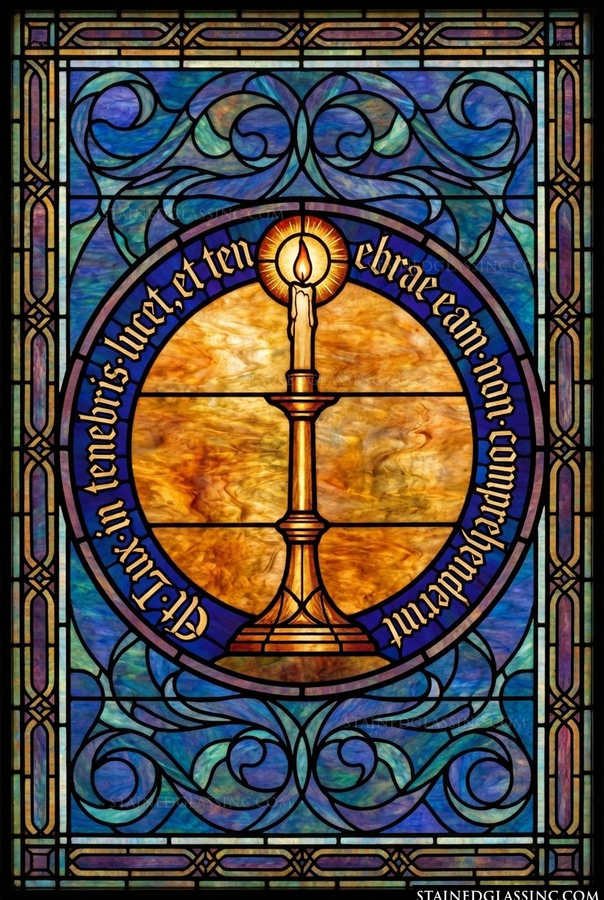 Encircling the candle is an elegant circular border inscribed with the timeless Latin phrase Lux in tenebris lucet, et tenebrae eam non comprehenderunt (The light shines in the darkness, and the darkness has not overcome it). Intricate, flowing scrollwork adorns the corners, framing the composition with artistic grace and visual depth.