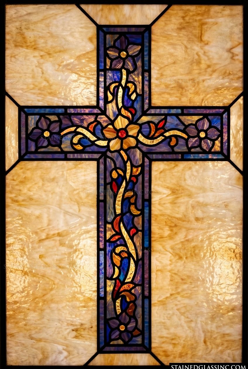This exquisite stained-glass-style artwork centers on a traditional cross, beautifully transformed by the grace of nature. Vibrant floral motifs wind their way across the structure, symbolizing growth and renewal within the sacred form. The harmonious interplay of golden blossoms and deep, rich indigo background glass creates a striking visual contrast that catches the light with remarkable depth.