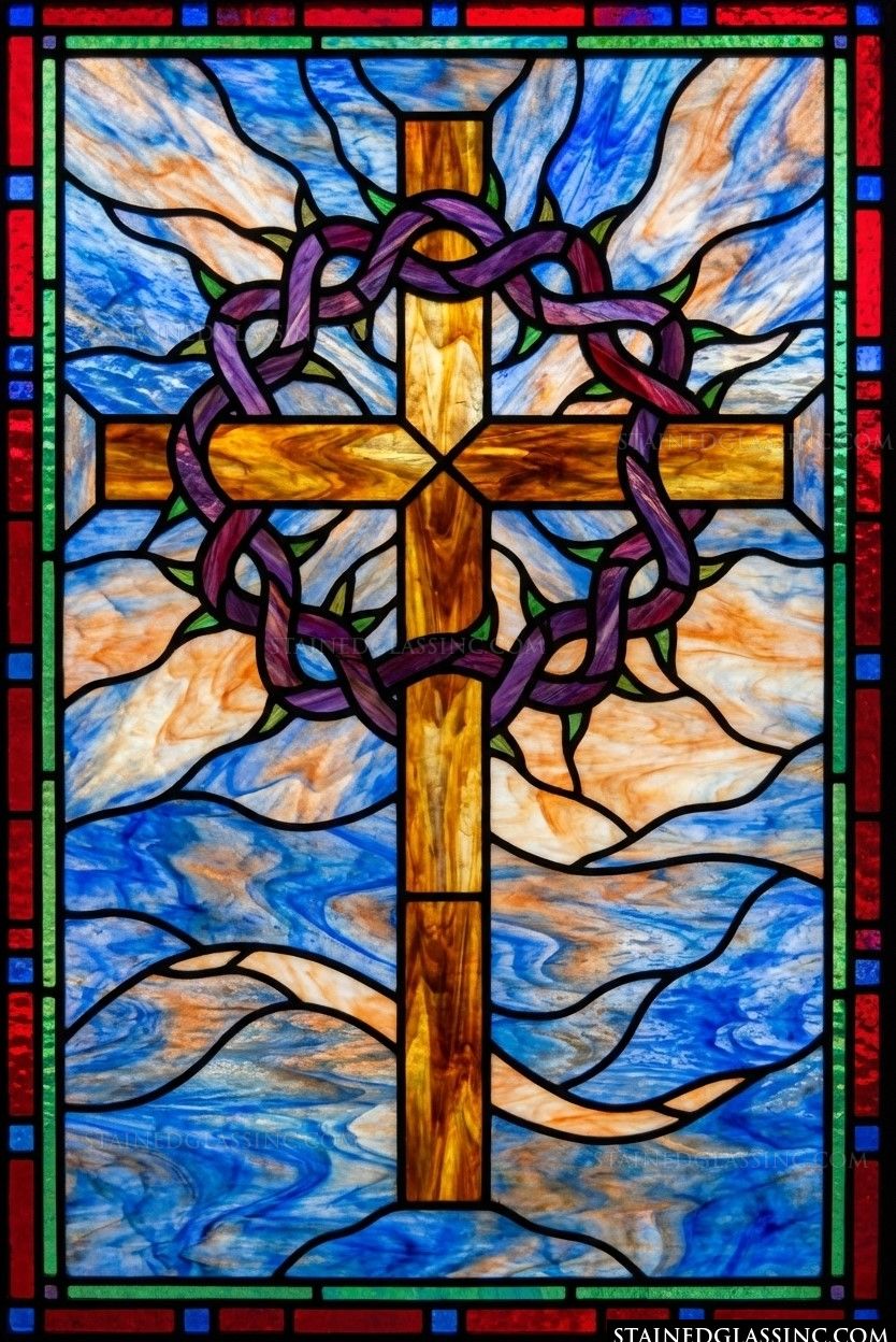 This luminous design centers on a radiant, golden-toned cross that serves as a powerful testament to faith. The rich, warm hues of the cross contrast beautifully with the deep, regal purple of the crown of thorns that rests upon it, drawing the eye to the heart of this sacred symbolism.
