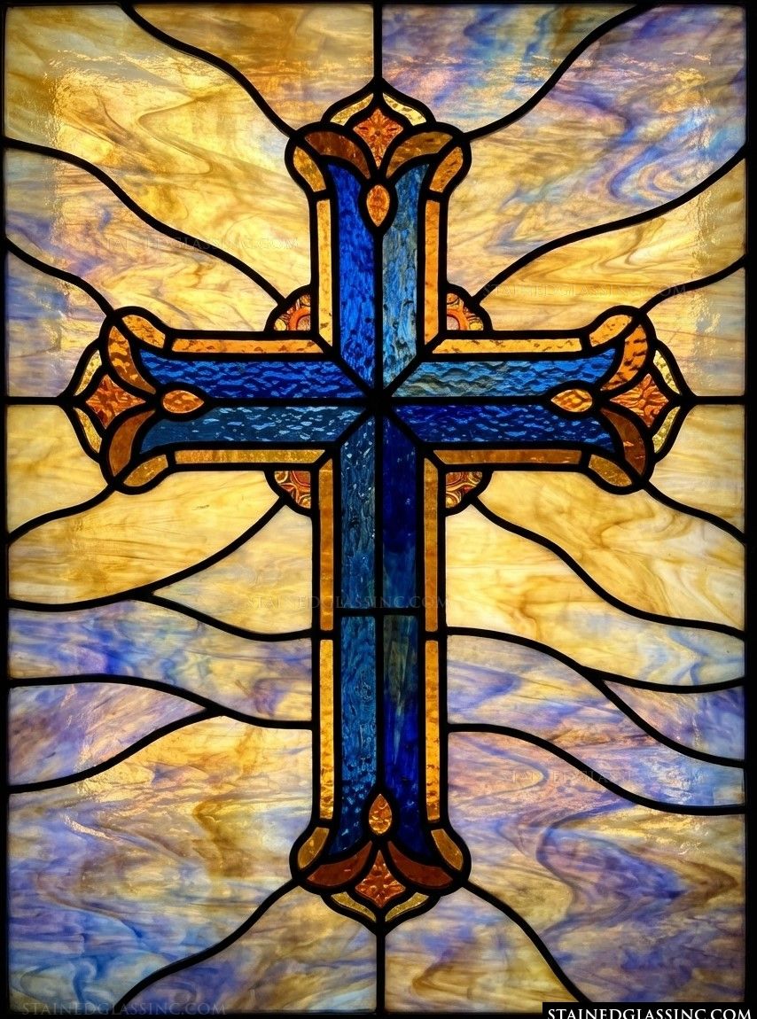 Embrace the timeless beauty of the cross with this radiant, stained-glass-style artistry. The central emblem is rendered in a deep, rich cobalt, serving as a powerful focal point of serenity and strength. The bold blue of the cross is perfectly complemented by intricate gold highlights, creating a striking contrast that evokes a sense of sacred light.