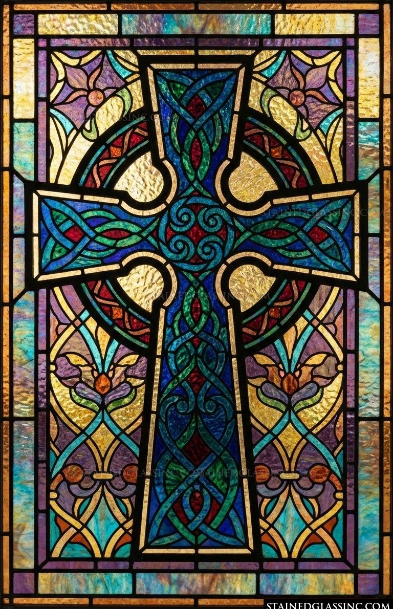 Embrace the timeless beauty of this luminous design, which showcases a classic Celtic cross as its centerpiece. Intricate, flowing knotwork in rich shades of sapphire and emerald dances across the surface, representing the infinite nature of faith and tradition. The vibrant colors are further enhanced by a background of glowing amber, creating a warm and inviting atmosphere.