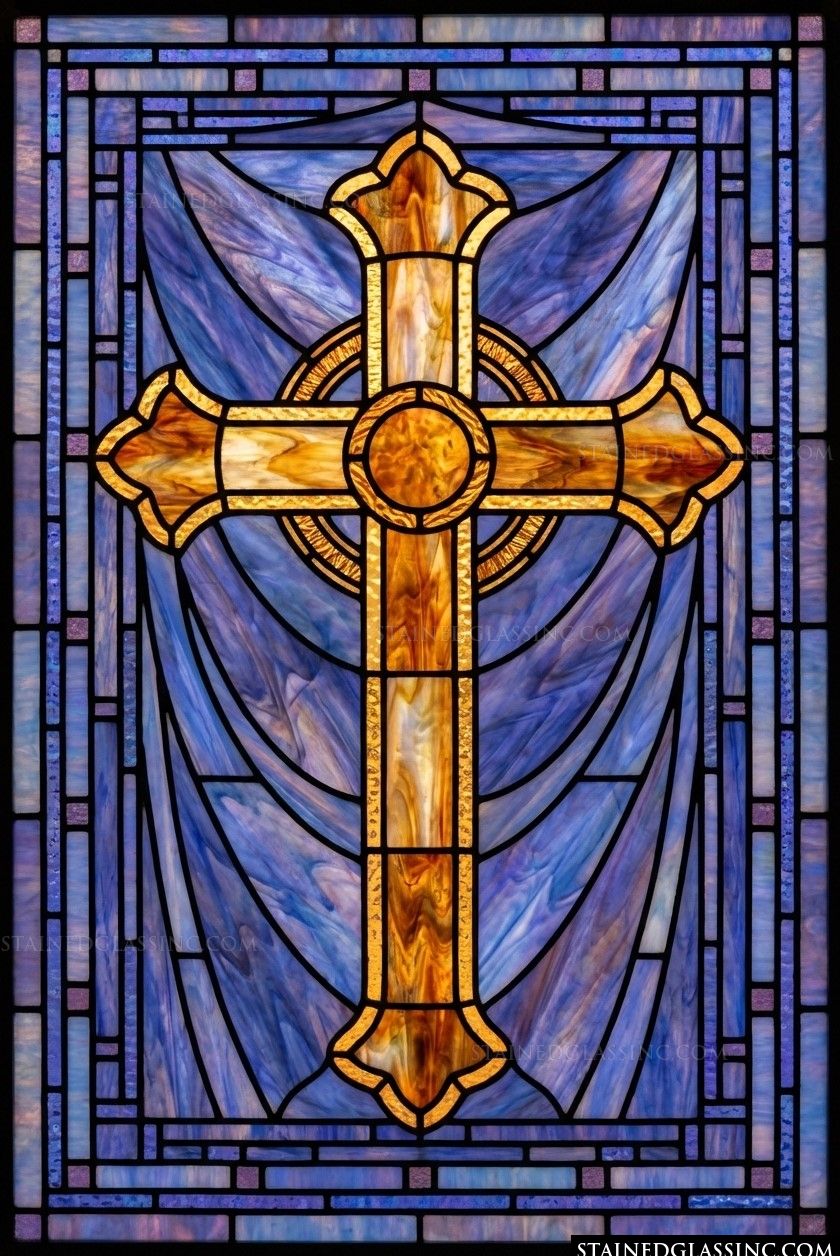 This striking stained-glass-style design centers on a majestic cross, rendered in warm, honeyed tones of amber and gold that seem to capture and hold the light. The intricate craftsmanship of the golden motif creates a beautiful focal point, radiating peace and spiritual depth.