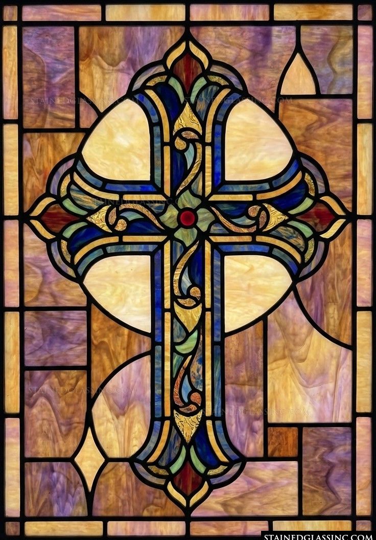 Embrace a timeless symbol of faith with this luminous design, where a beautifully ornate cross serves as the radiant focal point. The central emblem is masterfully detailed with flowing scrollwork, where golden flourishes intertwine with rich, deep blue tones. A single, bold crimson jewel at the heart of the cross adds a touch of warmth and spiritual significance, drawing the eye to its center.