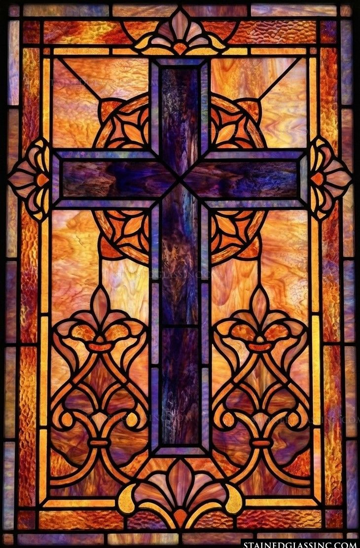 Surrounding the cross, a vibrant field of warm amber hues glows with the radiance of morning light. Ornate fleur-de-lis flourishes frame the lower portion of the scene, adding a touch of classical elegance and balanced symmetry to this profoundly uplifting work of art.