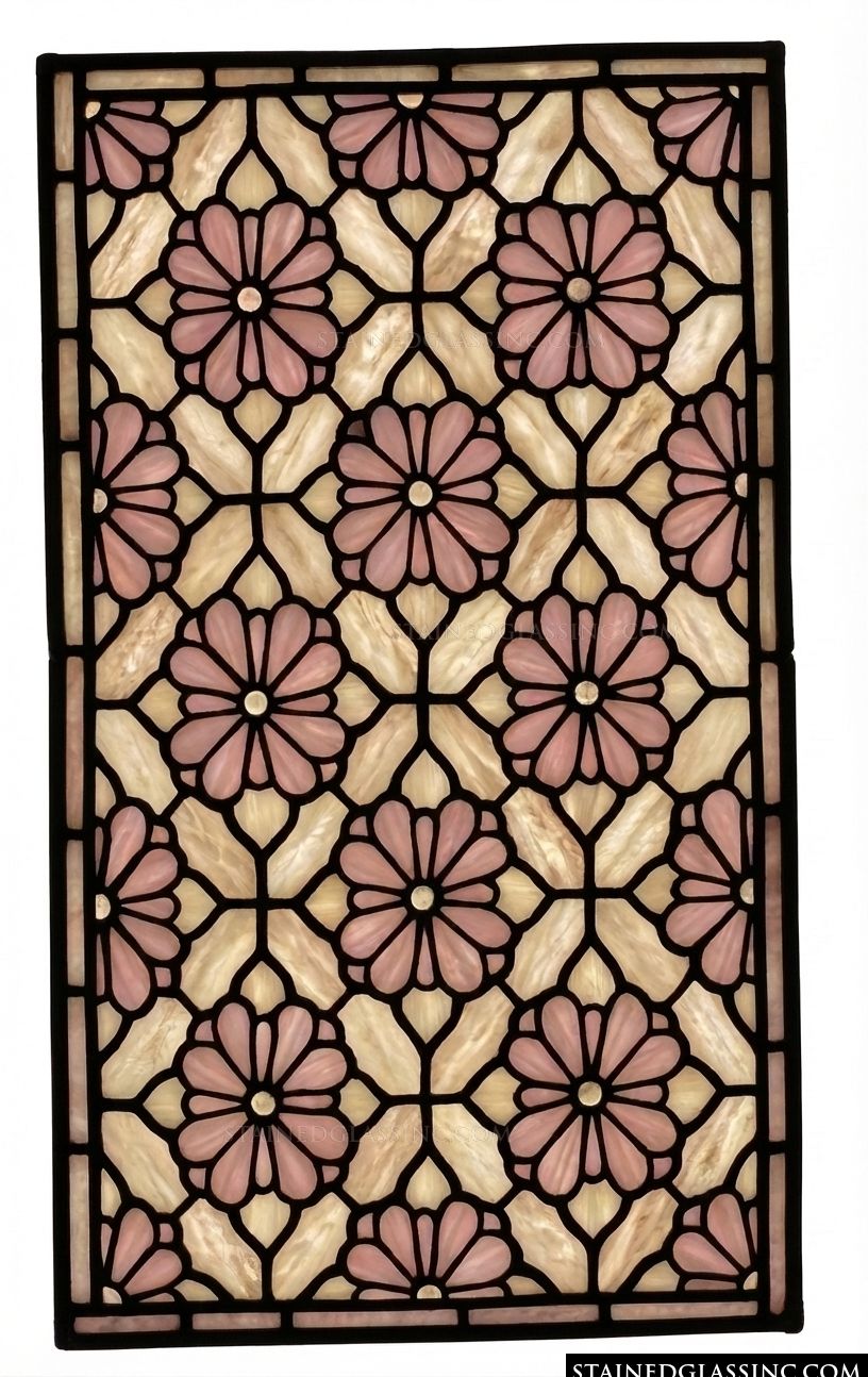 This exquisite stained-glass-style design captures the timeless beauty of a stylized floral trellis. Featuring elegant, soft mauve blossoms arranged in a harmonious geometric grid, the pattern creates a soothing and rhythmic visual experience that brings a sense of refined order to your decor.