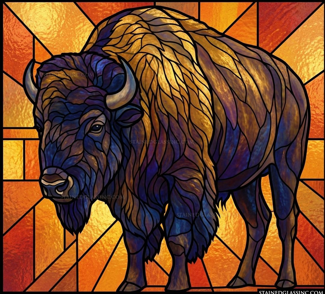 Embrace the raw power and stoic grace of the American West with this stunning bison artistry. The central figure is masterfully rendered, with deep, swirling blues and purples defining the powerful musculature and textured coat of the great beast. Its steady, grounded gaze reflects the endurance and strength that has long made the bison an enduring symbol of the plains.