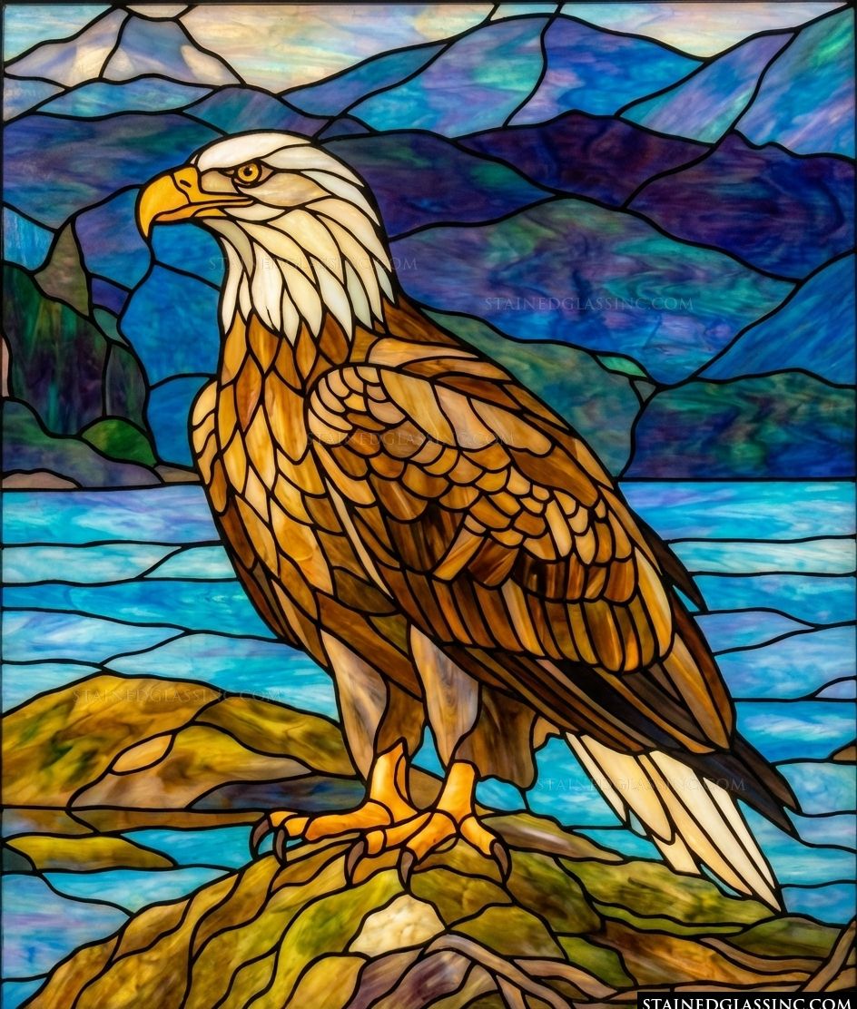 Embrace the spirit of natural wonder with this luminous design. A magnificent bald eagle stands as the centerpiece, its golden plumage and sharp, watchful gaze captured with remarkable artistry. The eagle sits stoically upon a rugged rock, surveying a serene landscape that evokes the peaceful grandeur of the American wilderness.